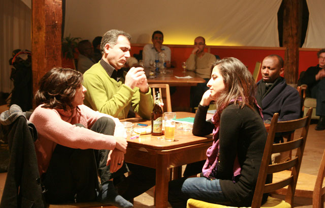 In WATITING bestimmt Warten das Leben der MigrantInnen: Warten auf eine Aufenthaltserlaubnis, auf einen Ausweis, auf Arbeit, auf einen Kontakt zu Menschen von hier. Warten bildet daher eine Brücke zu den biographischen Geschichten der MigrantInnen und zu ihrer Erlebniswelt. Unsere Spielaufgabe lag darin, dass diese sich mit dem zur Passivität tendierenden Zustand des Wartens auseinandersetzten, ihn mit ihren Lebensgeschichten verbanden und aktiv Optionen des Handelns aus dieser Konfrontation entwickelten. Warten war also unsere einfache theatrale Grundsituation. statt in dem zum Warteraum umfunktionierten Restaurant Zeughaushof im Kreis 4, wo die 13 Spielenden aus 11 Nationen für eine Nacht wohnten, lebten, assen, schliefen, spielten, sangen, erzählten und das Publikum einluden diese Zeit mit ihnen zu verbringen.