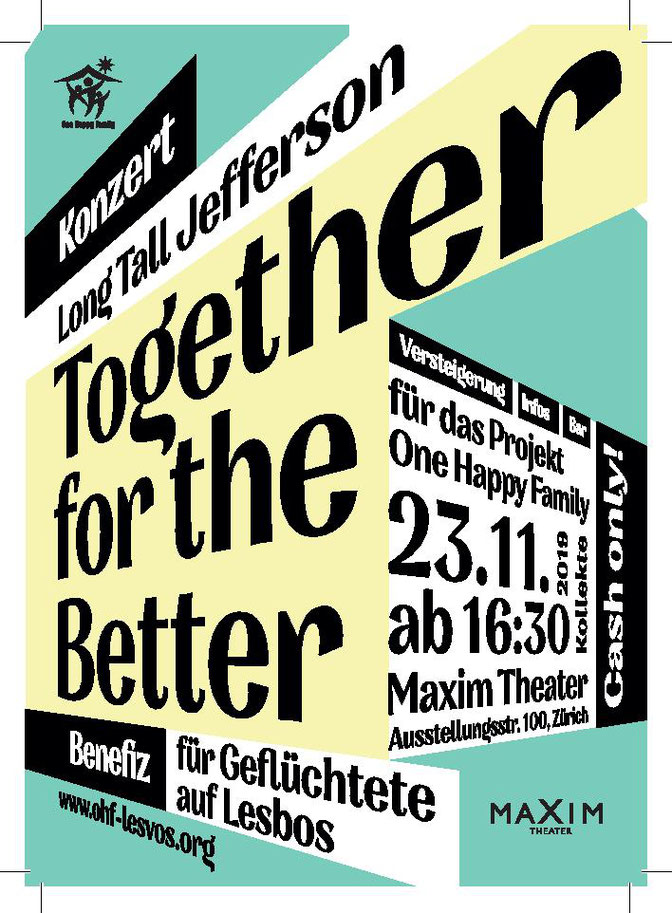 One Happy Family zu Gast im MAXIM Theater, INFOANLASS, VERSTEIGERUNG UND MUSIK (Long Tall Jefferson). Geflohen vor Krieg, Folter und Unterdrückung warten sie monate- bis jahrelang auf einen Asylentscheid in Griechenland. Das One Happy Family Gemeinschaftszentrum auf Lesbos bietet täglich 800 Menschen auf der Flucht einen Ort der Erholung, die Möglichkeit neue Sprachen zu lernen und eine warme, gesunde Mahlzeit zu geniessen.