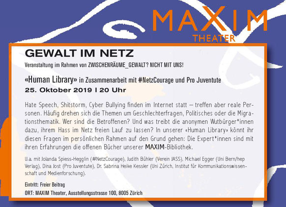 Veranstaltung im Rahmen von ZWISCHENRÄUME «Gewalt? Nicht mit uns!» HUMAN LIBRARY in Zusammenarbeit mit #NetzCourage und Pro Juventute Hate Speech, Shitstorm, Cyber Bullying finden im Internet statt – treffen aber reale Personen. Wer sind die Betroffenen? Und was treibt die anonymen Wutbürger*innen zu ihrem Hass? Die Expert*innen sind mit ihren Erfahrungen die offenen Bücher unserer MAXIM-Bibliothek.