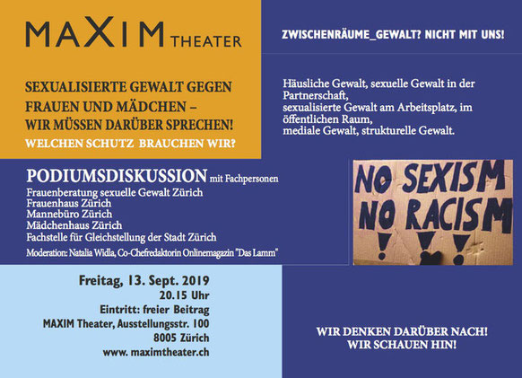 Am 25.November war der internationale Tag gegen Gewalt an Frauen und der Start der Kampagne 16 Tage Gegen Gewalt an Frauen! Das MAXIM Theater führt im Rahmen dieser Kampagne in Zusammenarbeiten drei Veranstaltungen durch: 25.November.2019, 20:00 Uhr: "Echt begegnen!" Human Library mit und zu geflüchteten Frauen*, in Zusammenarbeit mit TERRE DES FEMMES Schweiz. Am Samstag, 30.November.2019, 11:00-14:00 Uhr: Das Café Dona- Interkultureller Frauentreff kommt zu Besuch ins MAXIM Theater - Brunch und Vortrag zu "Die Stimmen der Frauen in der Aufarbeitung von Konflikten - in Bezug auf Nepal", in Zusammenarbeit mit PeaceWomen Across the Globe, Nagarik Aawaz und dem Café Dona. Am 03.Dez.2019, 19:30 Uhr: "Gegen die Angst, im Alter ausgeliefert zu sein" - Inputs durch Expert*innen / Diskussion, in Zusammenarbeit mit der Unabhängigen Beschwerdestelle für das Alter (UBA).
