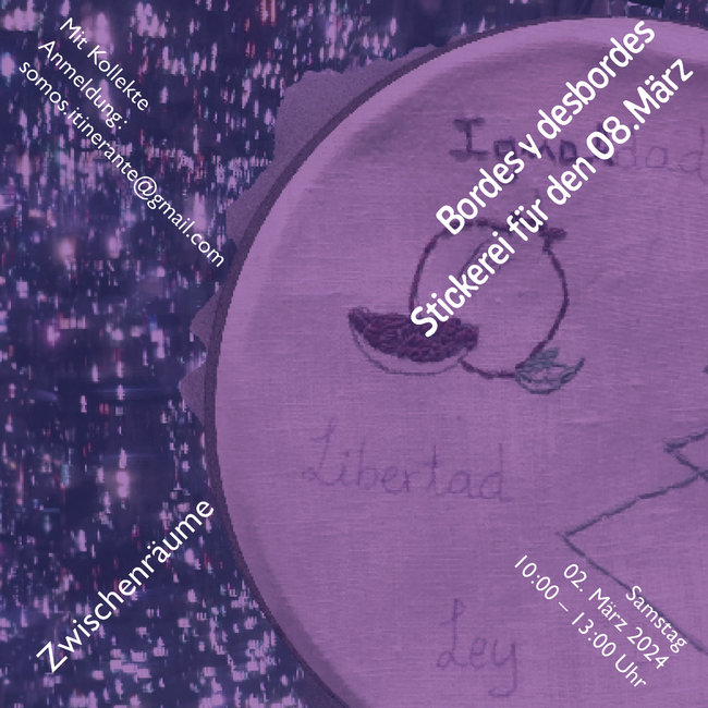 ITINERANTES lädt euch ein, im Vorfeld des 08. März, gemeinsam zu sticken und zu lesen. Bringt gerne das Medium mit, auf das ihr sticken wollt (ein Kleidungsstück, eine Tasche, ein Stück Stoff, das ihr nicht mehr benutzt) und einen Text, der mit diesem Tag zu tun hat, um ihn zu lesen, während wir sticken. Die übrigen Materialien werden euch zur Verfügung gestellt.