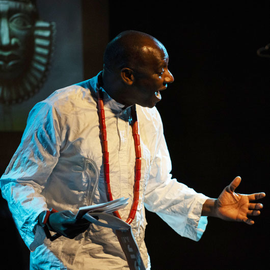 Schauspieler Amowie Oreoghene (Foto), geboren in Benin City, Nigeria, schlüpft in die Rolle eines Chiefs des Königreichs Benin und erklärt bei einem Museumsbesuch einer Schulklasse die Geschichte der gestohlenen «Benin-Bronzen»: Auszüge aus der Produktion GLEICHZEIT des MAXIM Theater geben kreativ und humorvoll Denkanstösse zu kolonialer Geschichte, Identität, Raubkunst und der Frage ihrer Rückgabe.